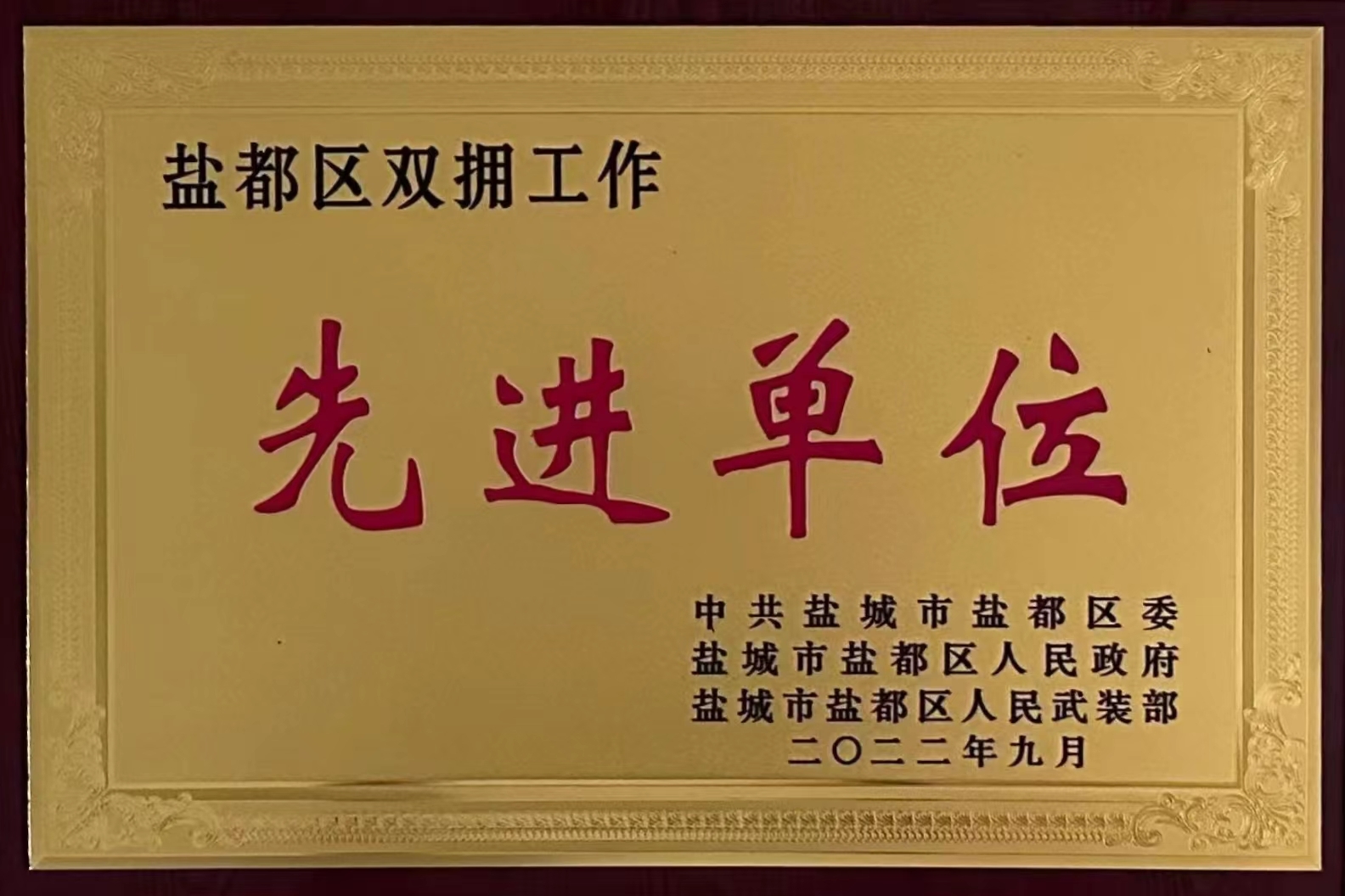 近日,經(jīng)區(qū)委、區(qū)政府、人民武裝部批準(zhǔn),集團(tuán)榮獲2022年度鹽都區(qū)雙擁工作先進(jìn)單位。