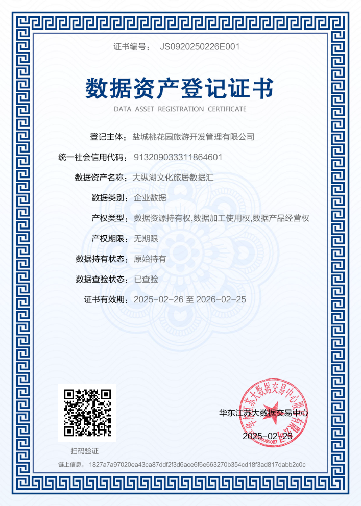江蘇大縱湖文旅發(fā)展集團(tuán)有限公司子公司鹽城桃花園旅游開發(fā)管理有限公司,依托桃花源景區(qū)豐富的文旅數(shù)據(jù)資源完成“大縱湖文化旅居數(shù)據(jù)匯”文旅數(shù)據(jù)資產(chǎn)入表,這是全市首筆國有企業(yè)文旅數(shù)據(jù)資產(chǎn)入表落地案例。